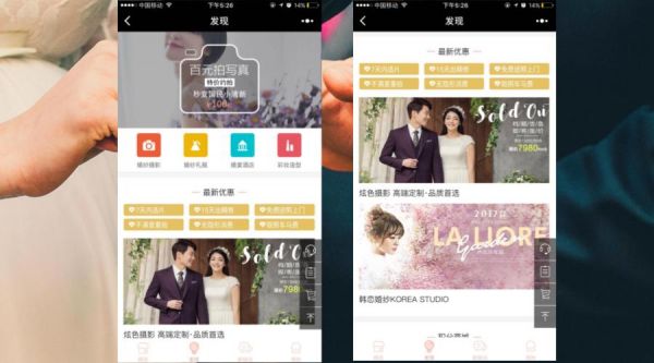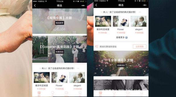 在首頁展示了不同系列的婚紗攝影套餐,結(jié)合具有意境的場景,凸顯不同系列婚紗的獨(dú)特魅力風(fēng)格,為了吸引及引導(dǎo)點(diǎn)擊打開頁面。通過主題式多角度詮釋婚紗攝影,給用戶帶來更強(qiáng)的視覺沖擊,給用戶的多樣化選擇空間,引導(dǎo)客戶的消費(fèi)選擇方向。