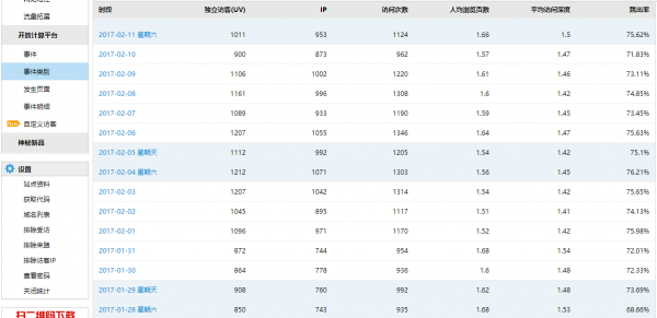我們網站的統計數據顯示的不僅僅是用戶如何瀏覽我們的網站,它們廣州企業網站建設公司還會顯示我們是否應該優化網站的設計,這其中我們應該查看的最重要的分析數據就是我們的跳出率。以下是在某網站的CNZZ(分析)部分流量截圖。從中我們可以看到,其日均跳出率已達到70%左右,也反應了該網站的用戶粘度??上攵@是多么糟糕的情況!