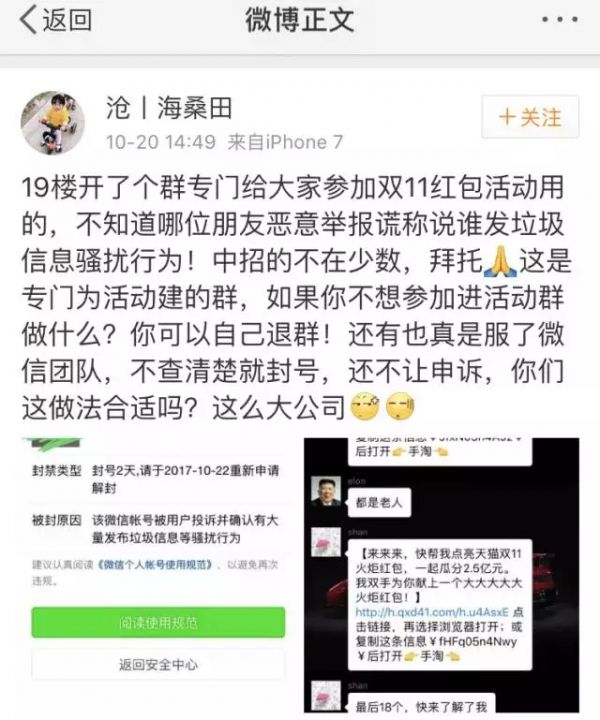 微商被封號肯定是服氣的,人家都制定了“安分、守己、低調、度過難關”的應對策略。不服氣的,顯然是那些自認是“正常用戶”,不過分享了幾次淘口令的人。