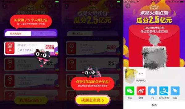 每個首次進入“火炬紅包”頁面的用戶,會得到五個待點亮的紅包,頁面一步步引導用戶,將自己的二維碼/淘口令分享給聯(lián)系人和各大社交平臺,微信赫然列在首位。