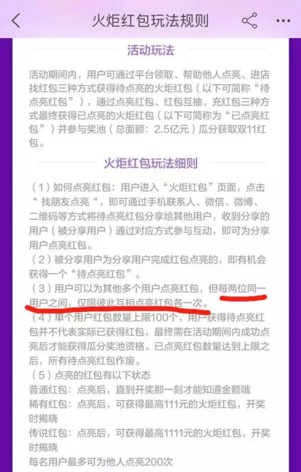 還有一條拗口又奇怪的規(guī)則“每兩位同一用戶之間,僅限彼此互相點亮紅包各一次”,并且,每名用戶最多為他人點亮200次。