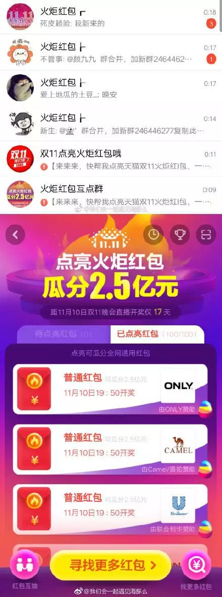 類似支付寶集五福的春節(jié)紅包,這個火炬紅包的金額也是未知的,號稱“獎金池”2.5億元(實際并非現(xiàn)金,是以雙十一紅包的形式計算金額),雙十一晚會直播“全民瓜分”,到時金額才會揭曉。