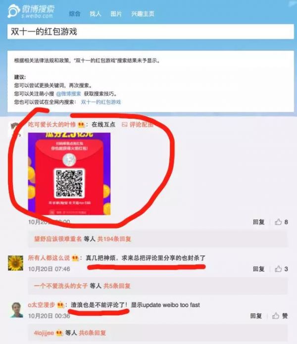 盡管微博已是阿里的社交流量池,“火炬紅包”的熱門推薦位還要維護,但戲哥發(fā)現(xiàn),微博其實也悄悄屏蔽了一些相關詞,并限制在評論中帶相關鏈接和二維碼。