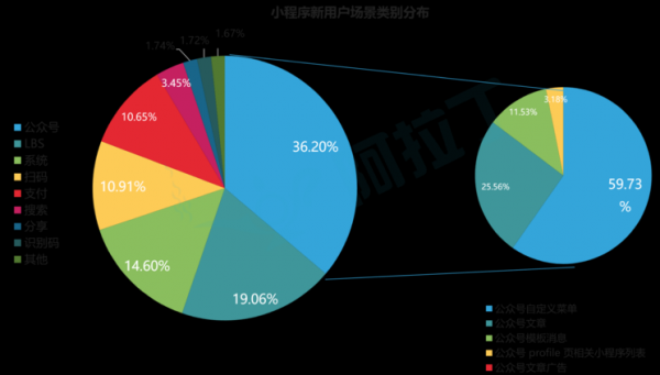 公眾號關聯小程序、文章中插入小程序等功能開放,讓小程序的入口場景變得十分豐富。小程序的新用戶中,來自公眾號的占到了 36.2%。