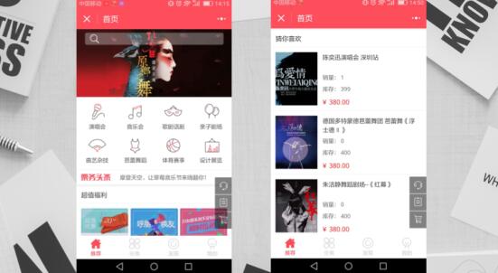分模塊展示:演唱會、音樂會、歌劇話劇、親子劇場、曲藝雜談、舞蹈芭蕾、體育賽事、設計,下方打造票務頭條,超值福利、熱門演出展示、猜你喜歡等,以及貼心的快捷鍵。根據消費者偏好,提供針對性的內容,對用戶數據標簽化,配套性的服務,打破傳統模式,實現精準推送與營銷。