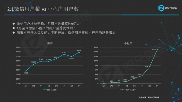 雖然小程序問(wèn)世的初期階段并沒(méi)有出現(xiàn)所謂的“流量紅利”,但其用戶量在4月份之后就出現(xiàn)了明顯攀升,8月份約有15000萬(wàn)臺(tái)設(shè)備使用過(guò)小程序,實(shí)現(xiàn)了成倍增長(zhǎng)。廣州微信小程序開(kāi)發(fā)有了前期的穩(wěn)妥布局,后續(xù)的集中發(fā)力便有了顯著的效果:面向個(gè)人開(kāi)發(fā)者開(kāi)放和門(mén)店小程序等能力的接入迅速降低了開(kāi)發(fā)門(mén)檻,吸引了大量商戶涌入;公眾號(hào)關(guān)聯(lián)、附近的小程序等入口的逐步開(kāi)放,也帶來(lái)了爆發(fā)式的流量增長(zhǎng)。