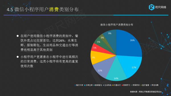 根據(jù)網(wǎng)上公開(kāi)數(shù)據(jù)及即速應(yīng)用后臺(tái)數(shù)據(jù)復(fù)合計(jì)算得出,在小程序消費(fèi)類(lèi)別分布中,排在前五的依次為餐飲外賣(mài)、水果生鮮、服裝鞋包、生活用品、交通出行,其中餐飲外賣(mài)占比位居首位,達(dá)到26%。廣州微信小程序開(kāi)發(fā)上述行業(yè)在一二線城市中的微信支付環(huán)境發(fā)展都已經(jīng)較為成熟,自然就為小程序帶來(lái)了巨大的用戶流量。另外,小程序推廣方式的多元化,會(huì)讓很多已經(jīng)入駐美團(tuán)等綜合平臺(tái)的商家愿意為獲取精準(zhǔn)用戶而做出更多嘗試。