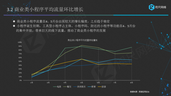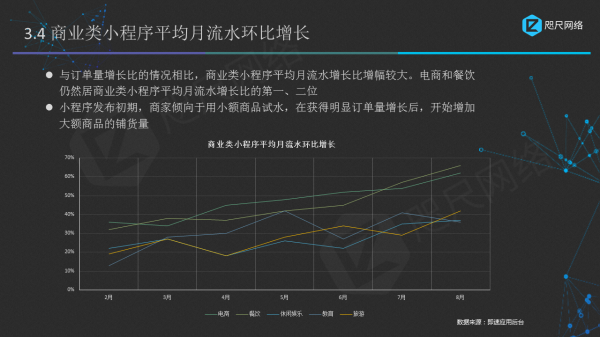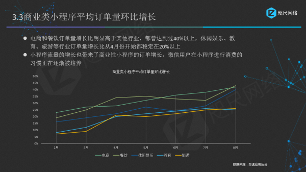 報(bào)告顯示,電商、餐飲、休閑娛樂(lè)、教育、旅游出行等行業(yè)領(lǐng)域的小程序一直在訪問(wèn)量有著持續(xù)的高速增長(zhǎng),其中電商和餐飲的流量環(huán)比增長(zhǎng)甚至在5月份分別達(dá)到了89%和92%。而廣州微信小程序開(kāi)發(fā)小程序用戶在這些行業(yè)領(lǐng)域的小程序上消費(fèi)意愿尤為明顯,因此流量的增長(zhǎng)自然也帶來(lái)了商業(yè)類(lèi)小程序的訂單增長(zhǎng)。可以看到,從5月份開(kāi)始,上述行業(yè)的訂單量環(huán)比增長(zhǎng)均保持在15%以上。