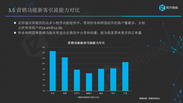 值得一提的是,在小程序開(kāi)發(fā)工具即速應(yīng)用提供的眾多小程序營(yíng)銷(xiāo)組件中,使用秒殺和拼團(tuán)組件的用戶最多,分別占比14.6%和12.3 %。會(huì)員卡、集集樂(lè)、預(yù)約、外賣(mài)等營(yíng)銷(xiāo)功能也備受商家青睞。廣州微信小程序開(kāi)發(fā)借助微信天然的社交屬性基礎(chǔ),許多電商小程序似乎已經(jīng)找到了區(qū)別于淘寶、京東等電商平臺(tái)的獨(dú)特營(yíng)銷(xiāo)模式。