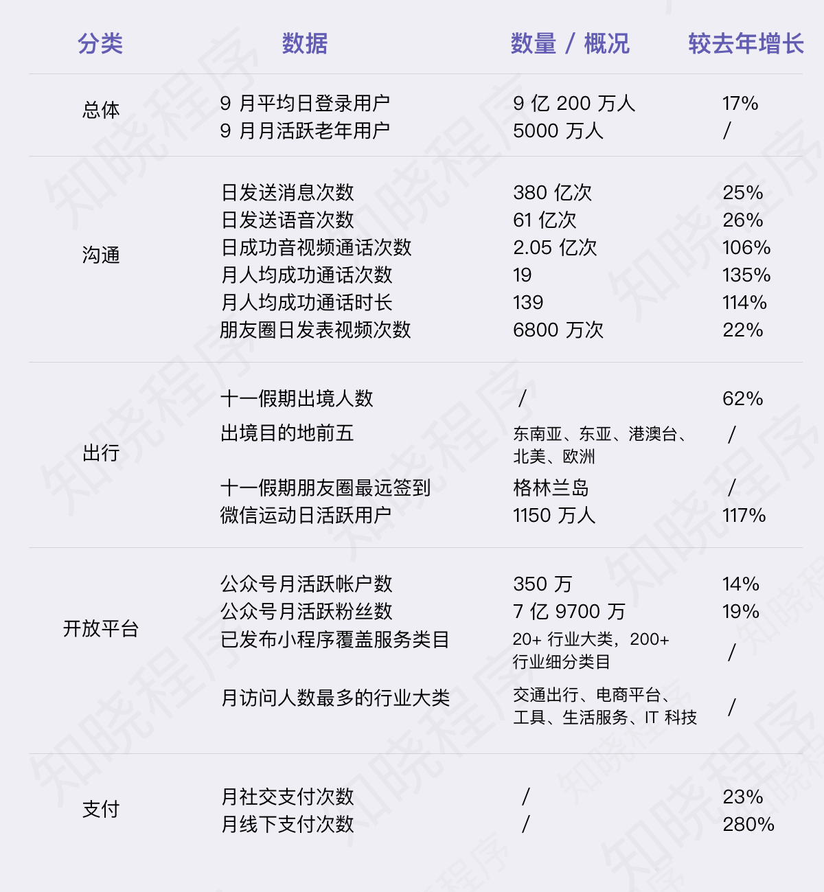 今年的報告,微信分別從總體(用戶)、溝通、出行、開放平臺、支付 5 個大類進行了公布。其中,總體方面,微信日登陸用戶達到了 9 億 200 萬,數據較去年仍然實現了恐怖的 17% 的增長。在用戶體量已經接近國內人口邊際的情況下,微信把尋求新增長尾用戶瞄向了老年人。