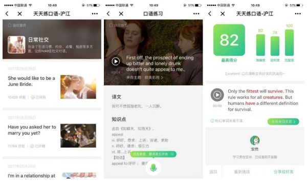 “天天練口語”是一款口語學習產品,在2016年11月上線。小程序里有專業詳細的評測、單詞糾音功能,場景化的口語練習內容,還配備了外教示范發音和知識點說明。