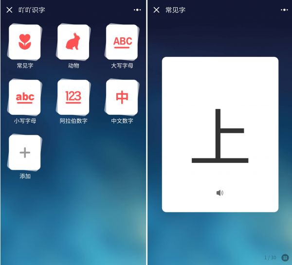 “吖吖識字”幫助1-3歲幼兒識字。字以卡片的形式出現,點擊喇叭狀按鈕,有標準的普通話示范讀音,向右滑動就會出現下一個。