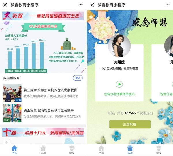 用戶還能在小程序里參加教育相關的活動。比如在教師節活動中,廣州微信小程序開發用戶既可以收聽多位業界優秀人士給老師的祝福語音,也可以選擇相應模板,親自制作一張電子祝福賀卡,發送給自己的老師。