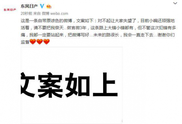 作為時下的熱點,不少企業官微也趁機轉發安慰,順帶蹭蹭熱點。但卻被東風日產的官博搶去了風頭,甚至還上了百度的時事熱點,隨后,東風日產官微發文承認錯誤,并自嘲稱小編還頑強的活著。