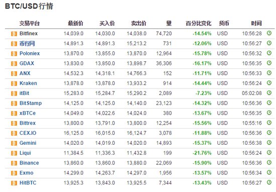 據Poloniex、GDAX等多個交易平臺數據,比特幣價格跌破14000美元大關。比特幣最近六天持續下挫,較高點價格跌逾30%。