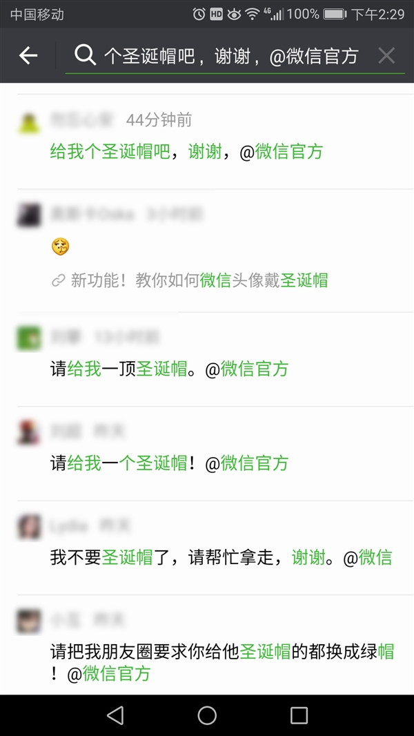 至截稿前,筆者朋友圈還有人在默默祈禱,“給我一個圣誕帽@微信官方”,甚至有人一連發(fā)了好幾條,鍥而不舍。