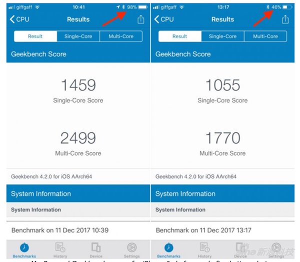 本月初,一位iPhone 6s更新至最新版本iOS 11之后運行非常緩慢,尤其和他兄弟的iPhone 6 Plus相比,于是他們用跑分軟件和電池續航應用做了一些測試。