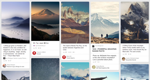 卡片式設計,顧名思義,就是將網站中的各種信息組織成卡片,每一張卡片有著屬于自己的信息。一張卡片可以以不同的形式、顏色呈現,不過一般而言,每張卡片會包含一張圖片或一個圖標,再加上一些基本信息,比如標題、文本等。在這些信息之中,圖片是卡片式設計的重中之重。這是因為人是視覺動物,在卡片式設計中使用圖片更能瞬間抓住用戶的眼球;一圖頂千言,高質的圖片更具說服力,往往令精妙的文案也區居第二。卡片式設計的優勢就在于以簡單的方式實現了信息和內容的高度融合。火爆一時的瀑布流就是卡片式設計的一個分支,國外的Pinterest網站是卡片式設計應用的典型。