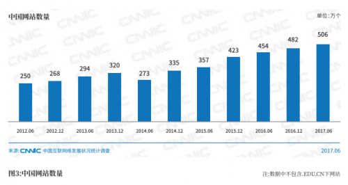據(jù)CNNIC第 40 次報告顯示,截止 2017 年 6 月,中國網(wǎng)站數(shù)為 506 萬個,這也是網(wǎng)站首次突破 500 萬個,網(wǎng)站歷年增長速度依然穩(wěn)健上升。