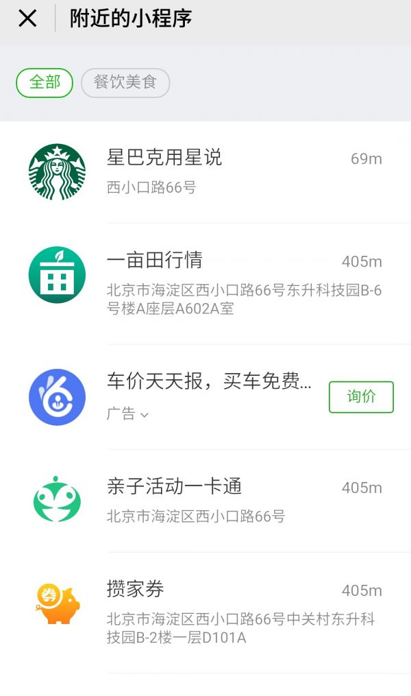 附近的小程序是微信開放的關鍵流量入口,特別是對餐飲和零售業起著舉足輕重的作用。同樣,附近的小程序也新增了廣告投放渠道,該廣告出現在附近小程序的第三行,點擊即可以打開對應的小程序。